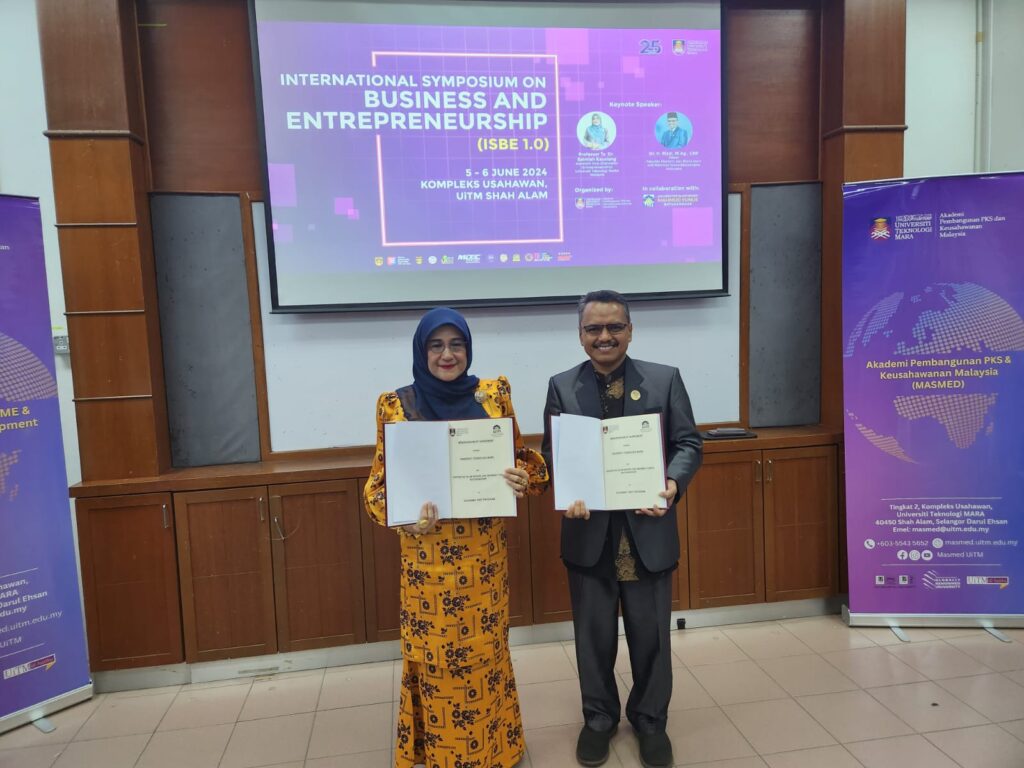 Shah Alam-Malaysia 5/6/2024, Dalam Rangka mewujudkan Visi Global Reputation FEBI UIN Mahmud Yunus Batusangkar, FEBI berkolaborasi dengan Universitas Teknologi Mara (UiTM) Malaysia melaksanakan beberapa rangkaian kegiatan yang bersifat cost sharing. Diawali dengan International Symposium on Business and Entrepreneurship serta Penyerahan MoA on Academic Visit Program, dengan Keynote Speaker Pertama Prof Ts. Salmiah Kasolang selaku Penolong Naib Cancelor (Assistan Vice Chancellor MASMED UiTM Malaysia), dan Keynote Speaker kedua Dr. H. Rizal, M.Ag., CRP yang juga merupakan Dekan FEBI UIN Mahmud Yunus Batusangkar.